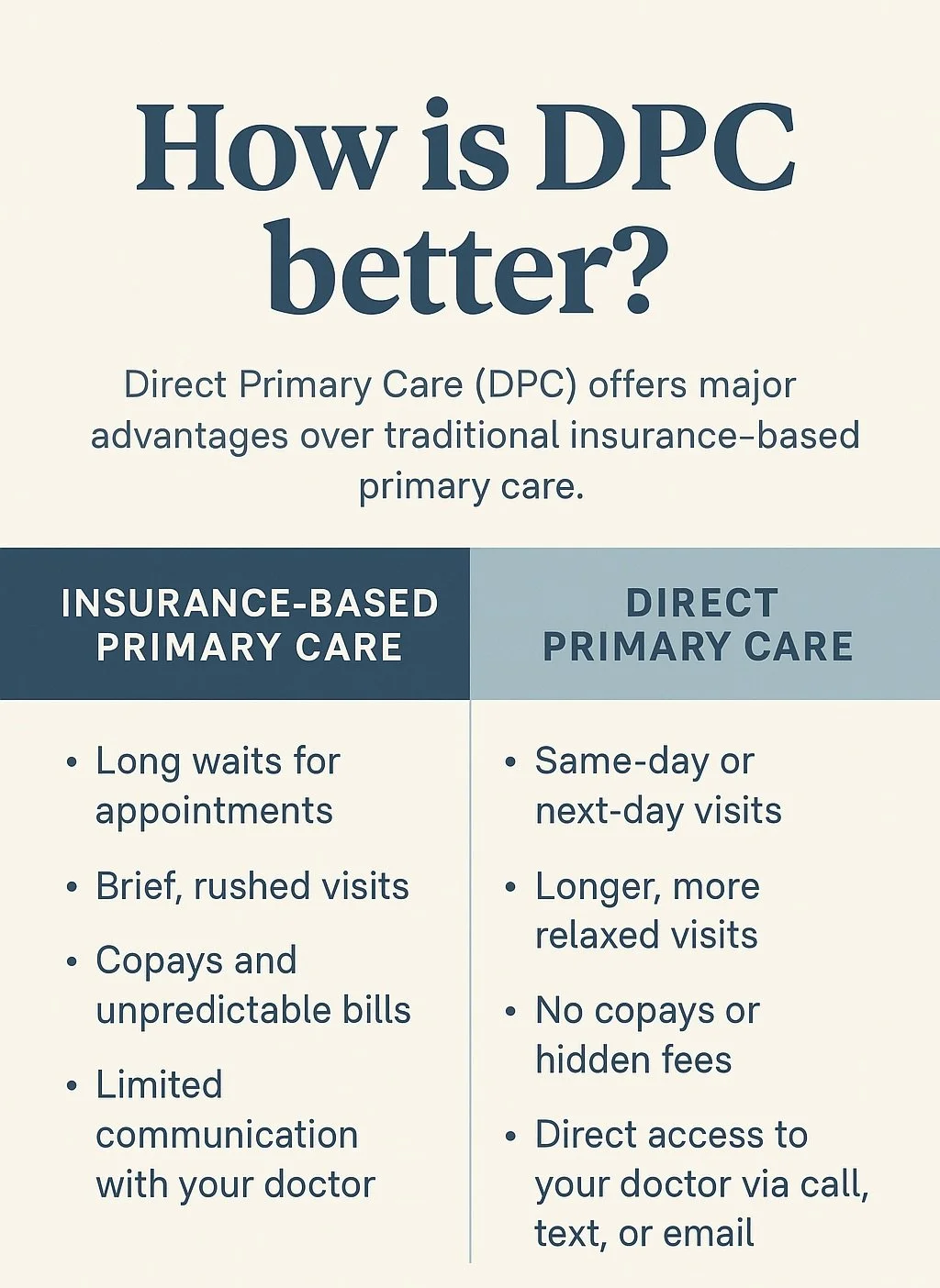 With Direct Primary Care, you get a doctor who actually knows you—not just your symptoms. You pay a simple monthly fee, and that’s it. No copays. No insurance runaround. Just real access to someone who listens, cares, and walks with you through your health journey.